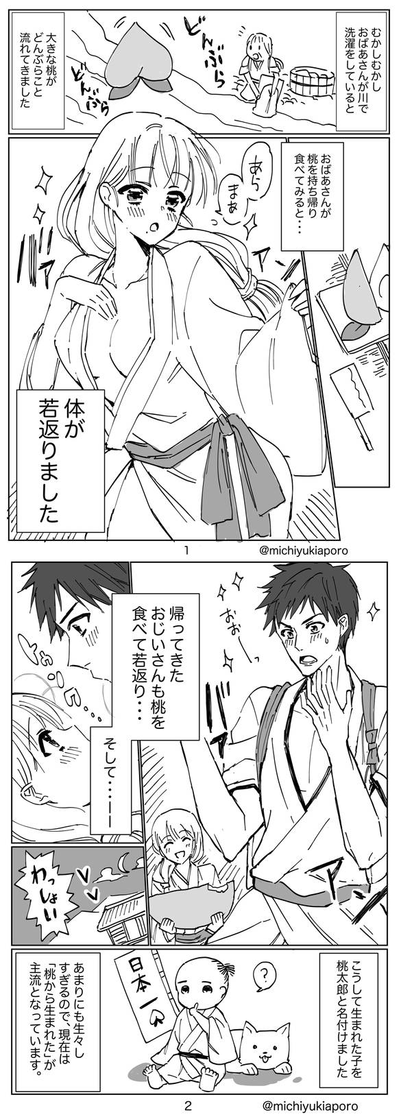 Subtype: kaishun-gata or "rejuvenation" - In this variant, he was born after the elderly couple ate the peach and regained their adult youth - Artwork by x.com/michiyukiaporo - (Higashi)