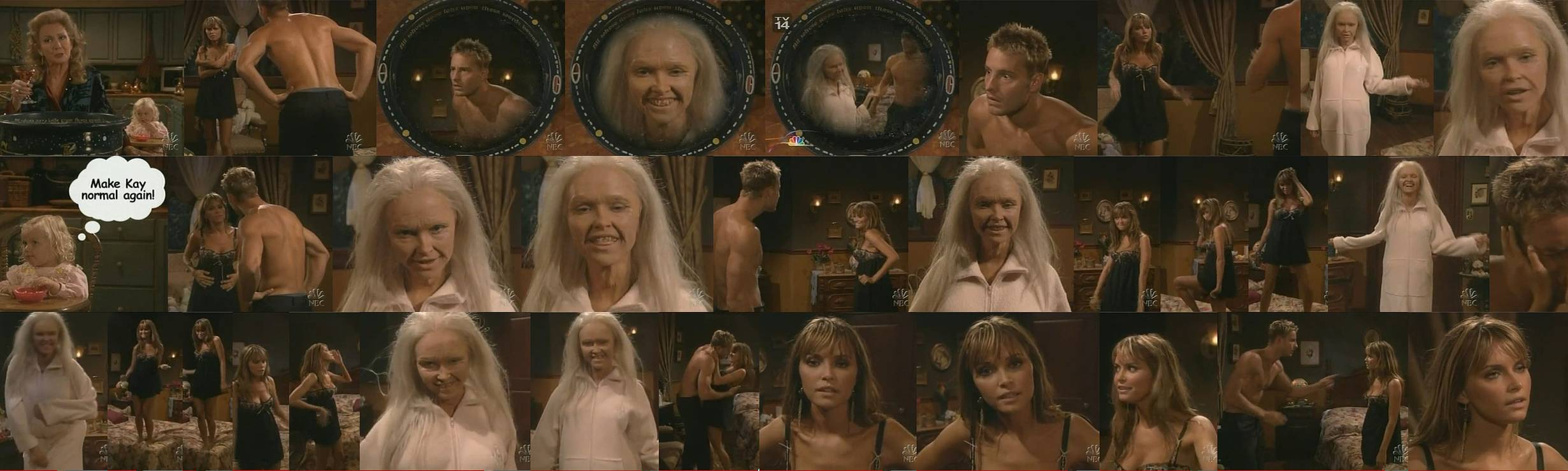 - (old age) Ep 1564, 9/7/2005. Tabitha casts a spell on Kay that turns her into an old woman, but little Endora is determined to make a love connection between Kay and Fox, so she conjures up a counter spell. Vid at group