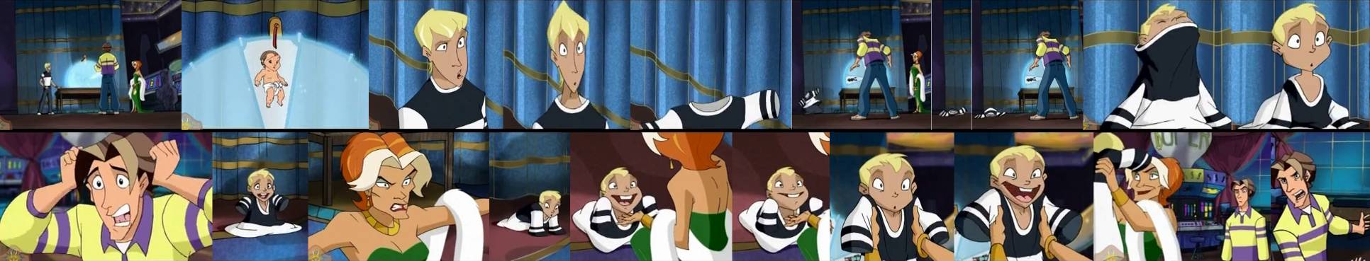 - (male AP) 3acv14 "Time Keeps On Slipping" 5/6/01. The professor ages his superbabies to adulthood, causing them to burst out of their cage. 2 boys transform into old geezers.