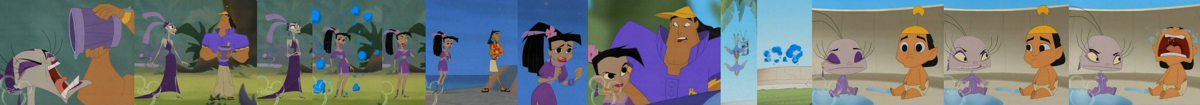 There is a forest of fountains with the power to transform or compel. Puss falls into the fountain of 100 changes, where everytime he hiccups he endures a different effect (bird TF, walk on hands, speak backwards, etc.) At one point he becomes a kitten... although could be just a regular cat (all he says is "Mew"). At the end he hiccups again and definitely becomes a kid, with his hat large on him and a squeaky voice. It's only for a few seconds, as he hiccups offscreen to close out the episode.