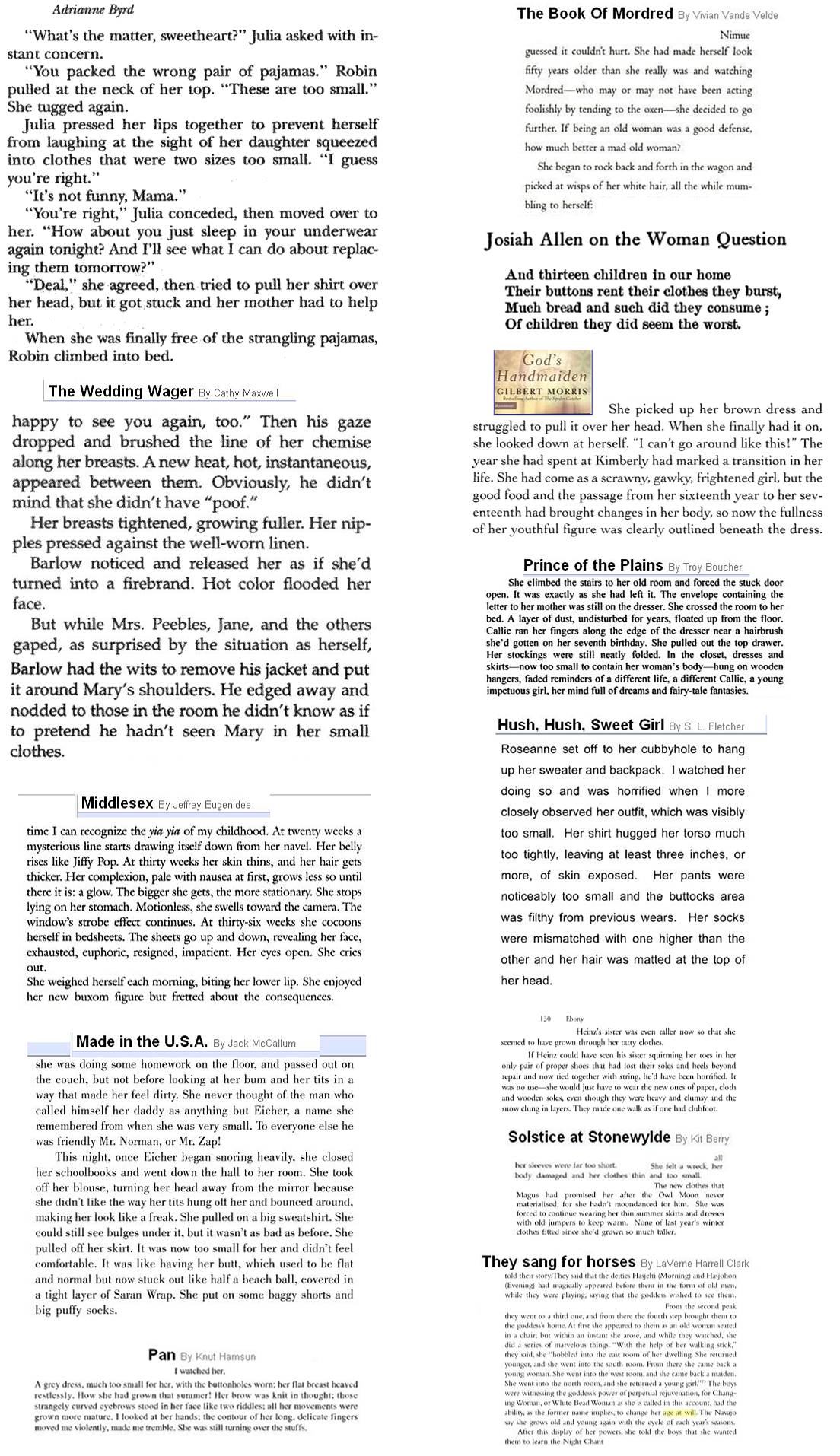 "They turned out to be age nineteen, but were a decade downtime from him, so as they traveled east they grew younger. When each passed twelve, her large bare breasts faded out and her body became spare.