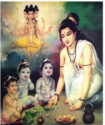 Look! the Trimurthis turned into toddlers and started crying. She suckled them each with milk of divine knowledge. Atri was surprised to finding the infants playing on the lap of his wife. Seeing all what happened with his inner eye; he felt elated when the Vanquished Trimurtinis appealed to the mercy of Matrumurthi Anasuya for Patibiksha.