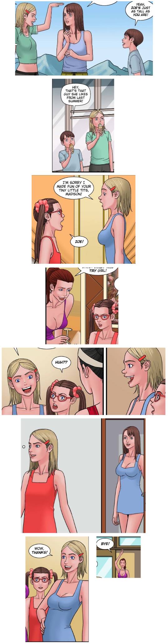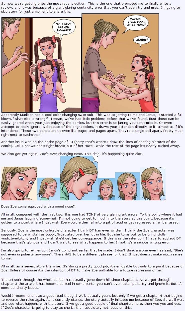 But to be honest, the rest of the cells in the comic seemed pretty spot on. That was the one huge error. There are a few cells I have issues with, but they're super super minor and not even really worth mentioning at this point. Let's get on to the next one. Flu Shots 2: Starting with the story, it's actually pretty well written at this point. We know who ALL of the characters are now, we can remember their names, and each one has a distinct personality. Which is awesome, because it's been one of my chief complaints lately to DT. We get some small regression in this one and one larger progression. It almost seems like we're jumping ages really fast here. It's slower than most of DT's work, as it's spanning multiple comics, but the regression itself only lasts a panel or two at a time. Which is awesome if you own all three volumes and can just binge read it. Not so awesome if you only owned one. So it's kind of a trade off at that point, pretty much, what would you rather have. Personally, I like it. But, we have a problem, I now hate Zoe even more. I honestly want to see her regress in the most inopportune time in the future series of this comic to embarrass the hell out of her. This panel kind of explains it all. To provide some context, Zoe just made fun of Madison's breasts being so small, mom has told her to apologize. Yeah.. I want to punch her in the face. Mom just kind of blows it off and just walks Madison away without any punishment for Zoe. Even as they're leaving, Zoe is still relentlessly teasing and making fun of Madison. Not much else to really go into here now though. Let's get onto the artwork.