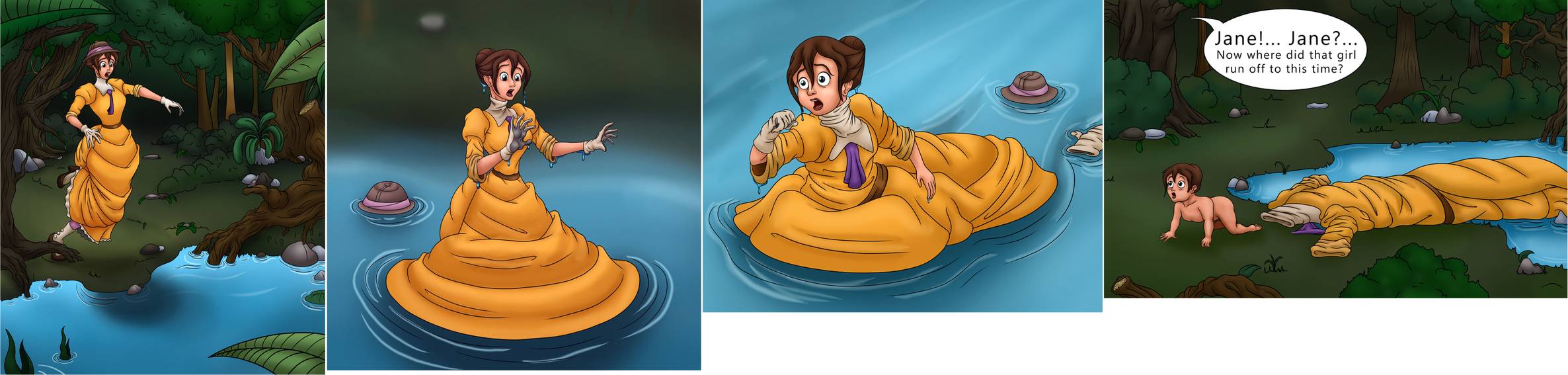 It didn't take Jane very long to figure out something weird was happening. Quickly she tried her hardest to get back to the bank before she'd drown in both the pond and her dress.